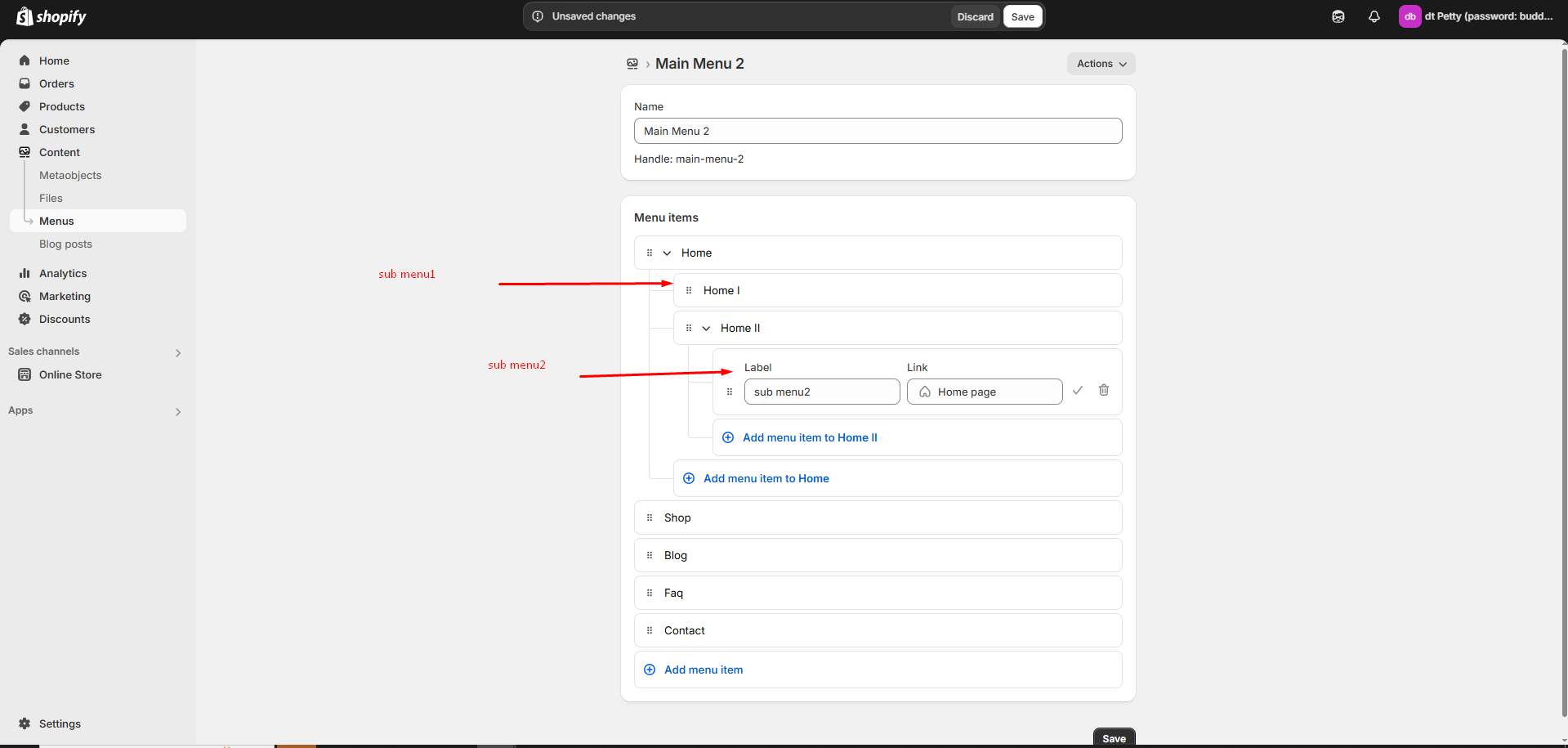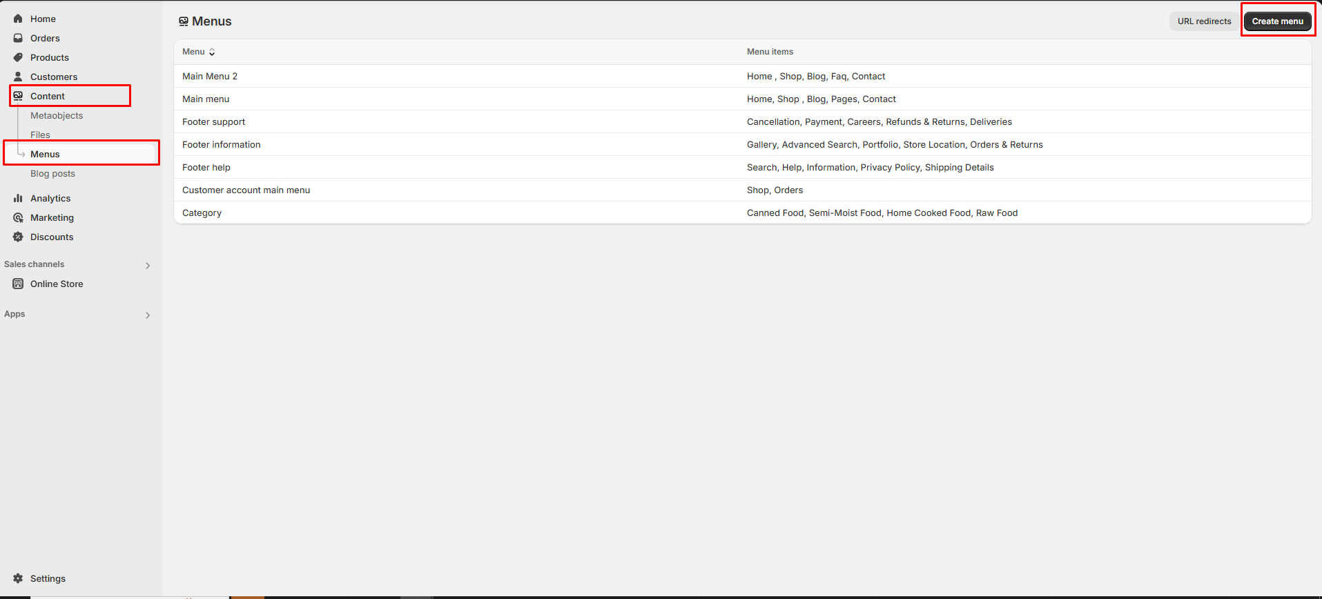 • Go to Online Store > Content > Menu in your Shopify Admin.