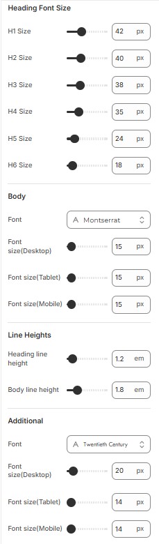 • Additional Font size: Adjustment of additional fontsize of Desktop , Tablet and Mobile can be done as per theme requirements.