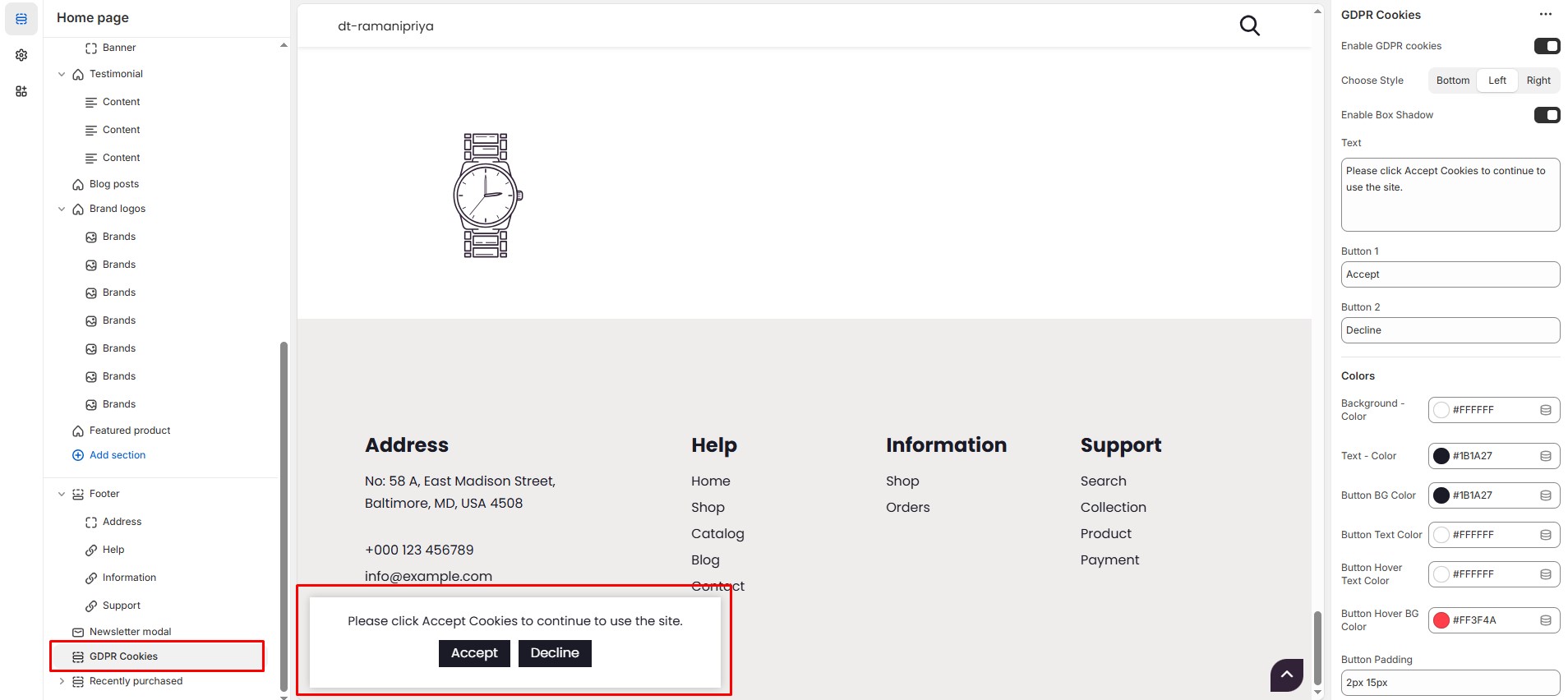 The GDPR Cookies Block in the Footer Section allows you to display a cookie consent banner, ensuring compliance with General Data Protection Regulation (GDPR) laws by informing visitors about cookie usage on your store.