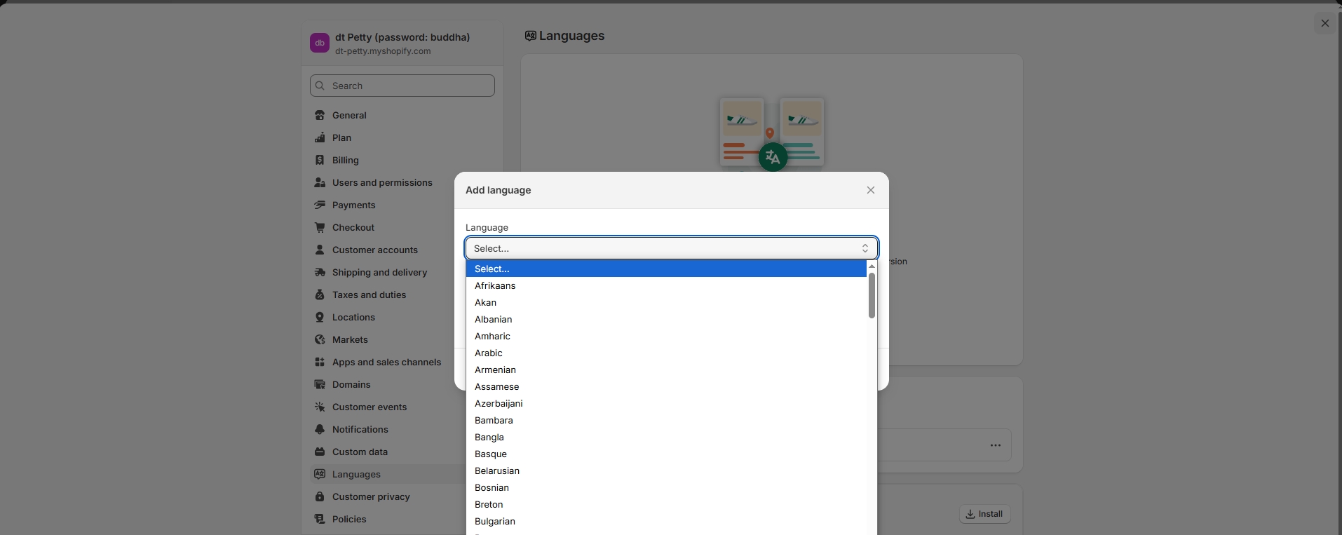 Open Admin Store Settings > Languages > Install translate & adapt app ( Shopify Translate & Adapt).
